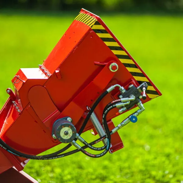 Wysoki komin wyrzutowy z możliwością regulacji w zakresie 360o umożliwia precyzyjne kierowanie strumieniem wyrzutu zrębek, a ruchoma górna osłona zapobiega ich rozrzucaniu we wszystkich kierunkach.